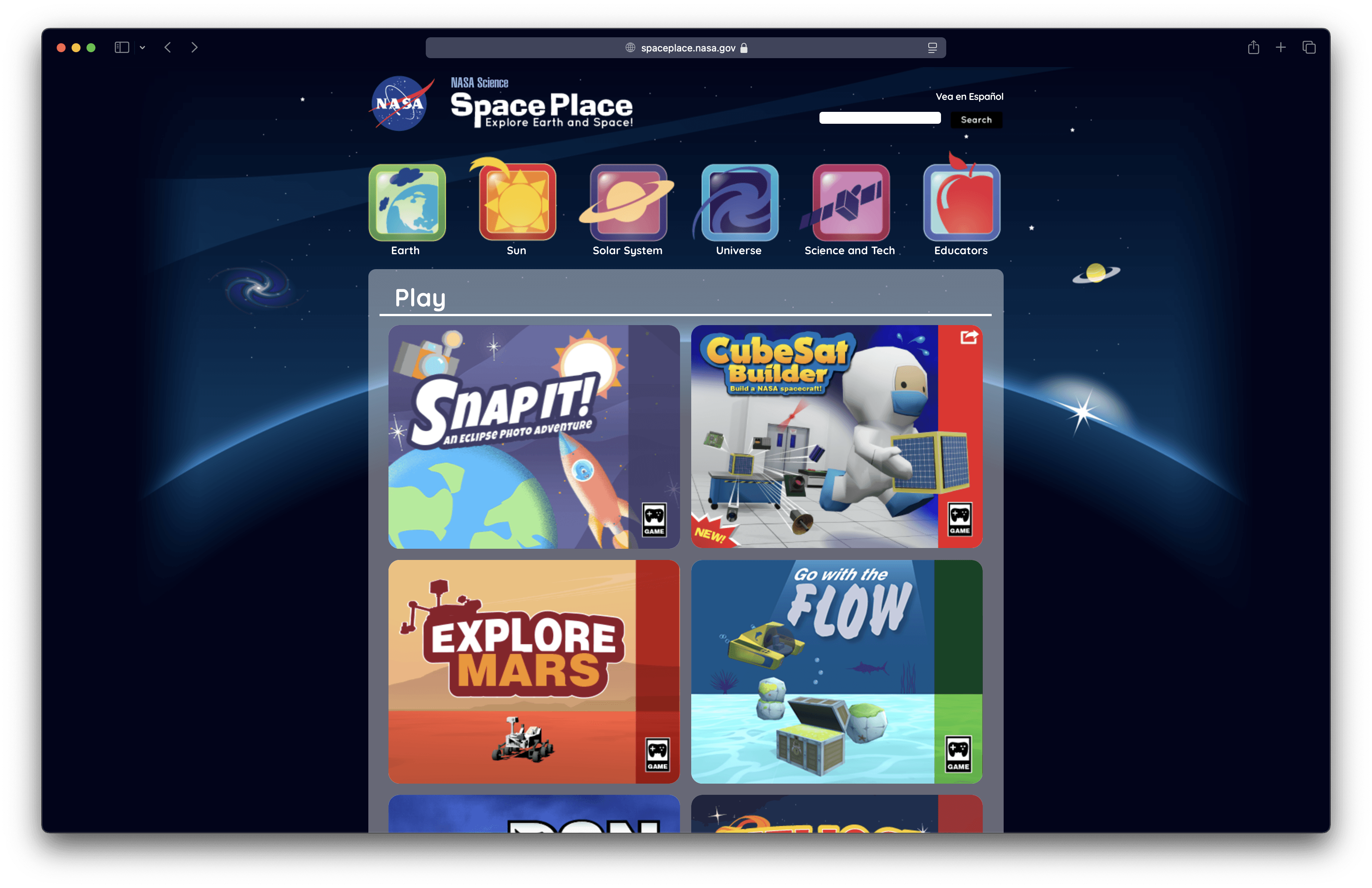 Inspired by the complexity and beauty of celestial systems, this project reimagines how we explore the cosmos through virtual interaction. While researching, I came across NASA's Space Place website for Kids, which explains the Solar System and offers a few simple flash games for educational purposes. While some looked interesting, I realized they wouldn't have engaged me as a kid because the interactions were limited to static visuals.